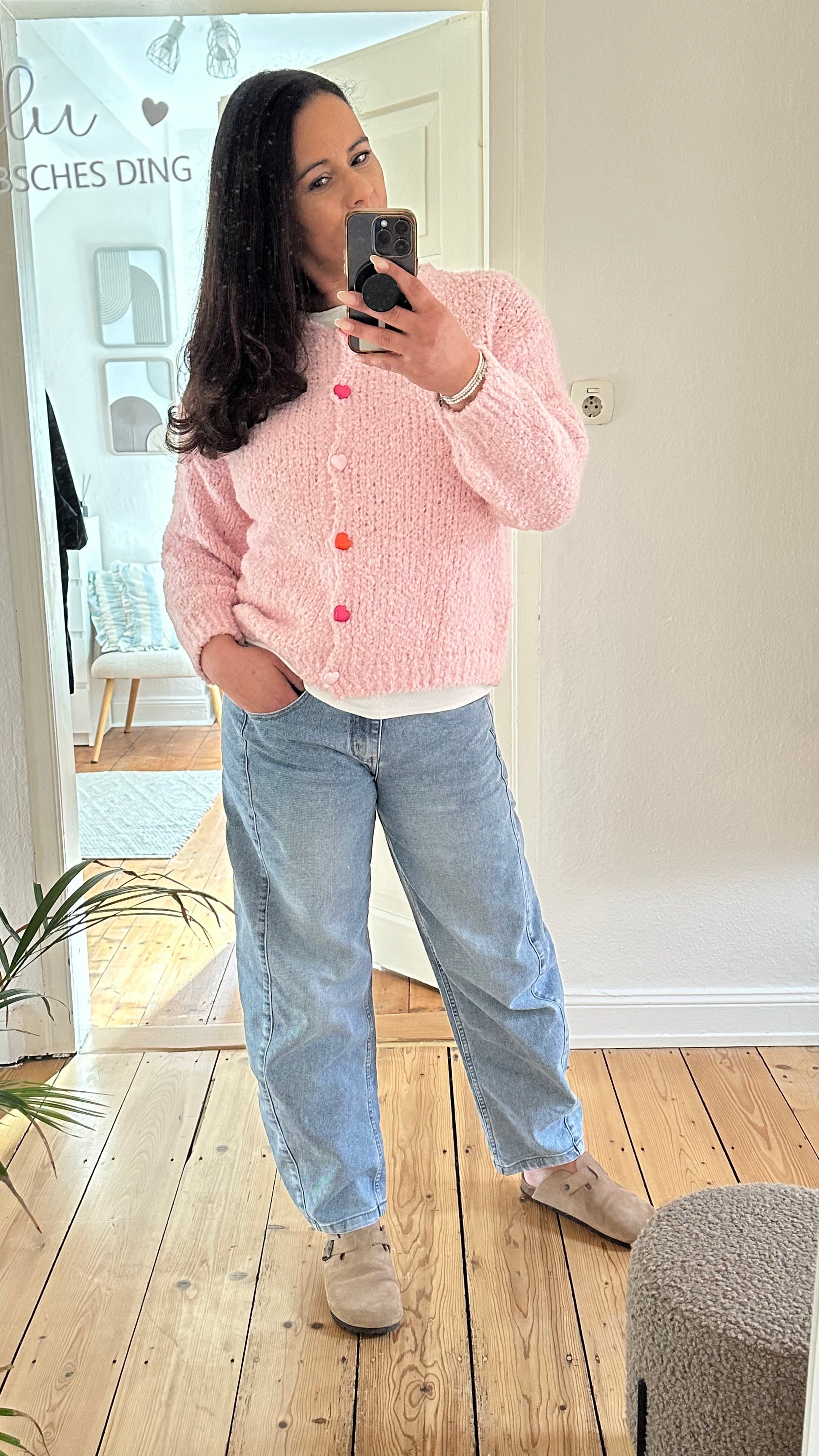 Weiche, in zwei Farben erhältliche Strickjacke aus flauschigem Material für maximalen Tragekomfort. Die Vorderseite wird mit fünf liebevoll gestalteten Herzknöpfen in Rosa-, Pink- und Orangetönen geschlossen – ein verspielter Hingucker für jeden Anlass. Perfekt zum Wohlfühlen und Kombinieren.
