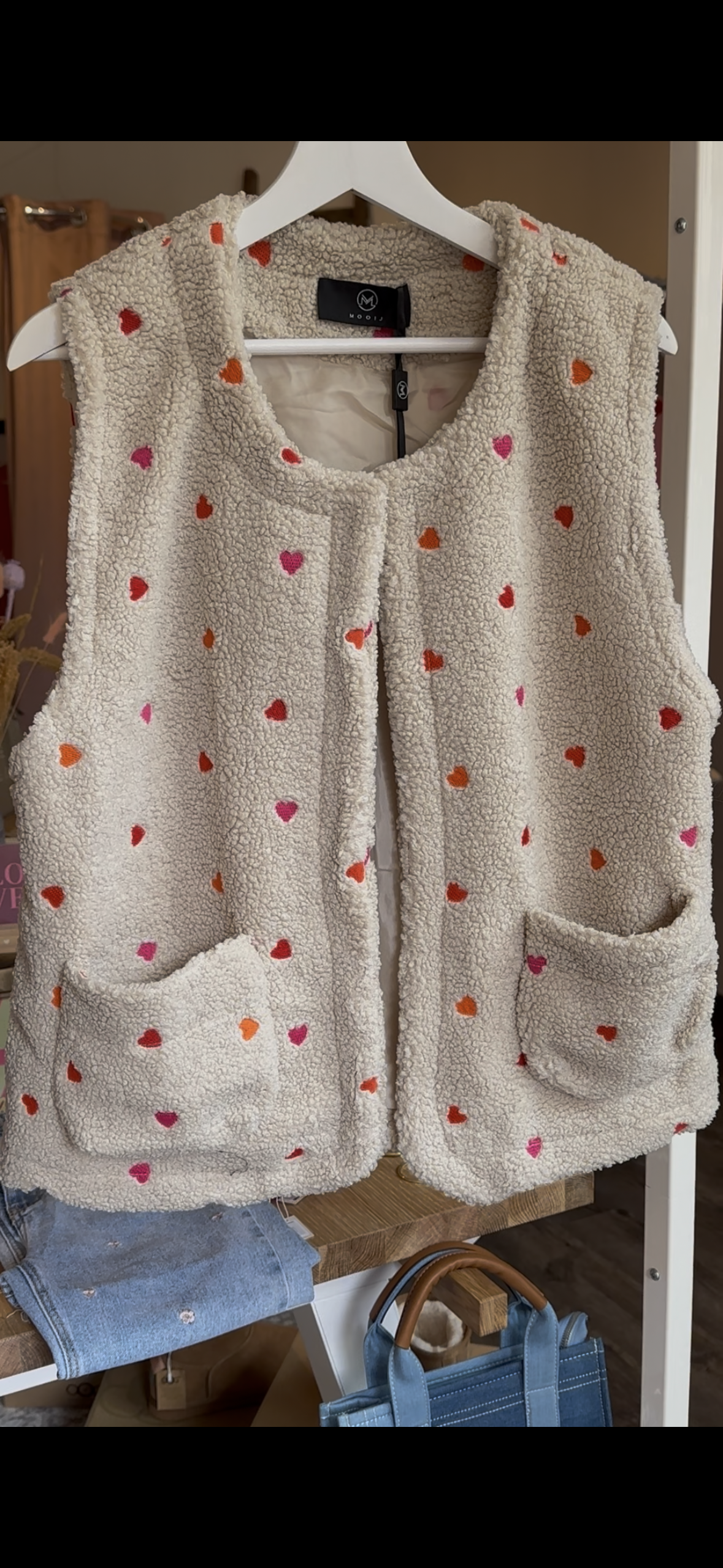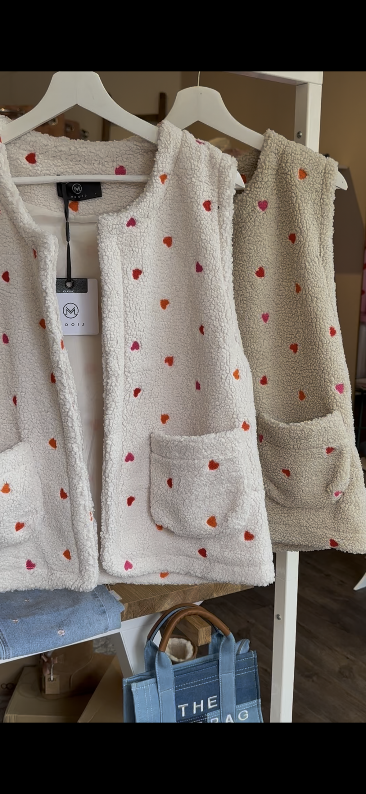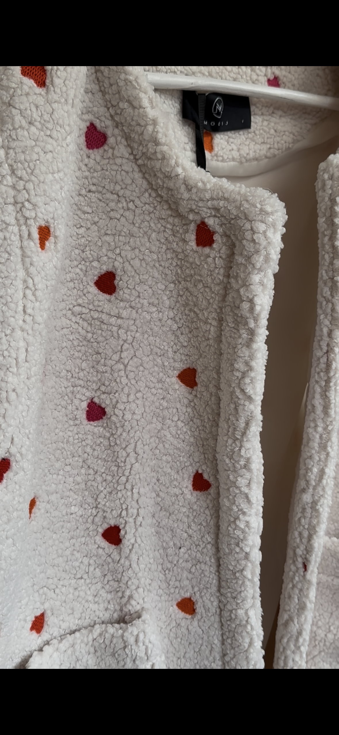Die Virale Teddy Weste bestickt mit Herzchen in orange, pink und rot.